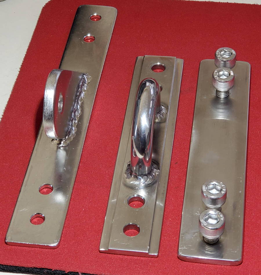 I fabricated a new and beefier mainsheet bail to fit the track on the bottom of the mast. I took a 1/2" SS u-bolt, cut off the threaded ends, and welded it to a SS plate. I also made a threaded backing plate that goes inside the boom. I also got a new tang for the rigid boom vang made to fit the track in this boom by Garhauer.