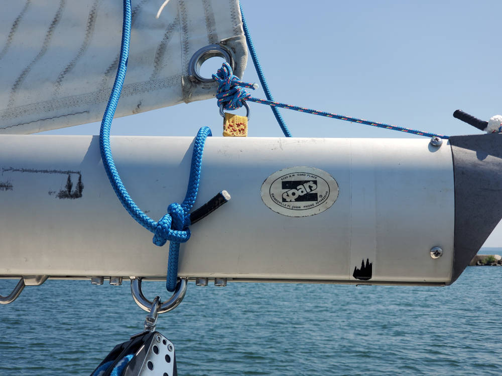 I added a 5:1 outhaul purchase inside the boom. The control line leads to the forward sheaves and out through one of the cam clutches where it is secured. There are two double blocks with the forward one fastened to a bar I mounted inside the boom about 4 feet from the end. A small dynema line runs over the sheave at the boom end and is tied to the mainsail clew and outhaul slide.