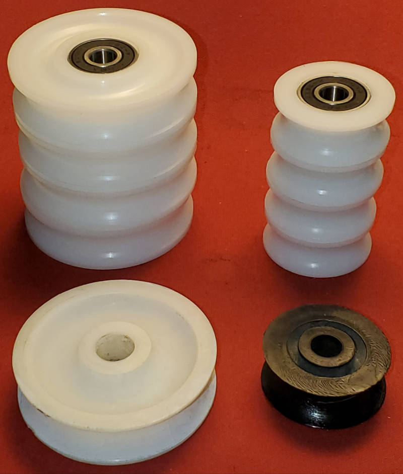 The Z-Spar boom has sheaves at both ends for reefing lines and outhaul. These were all well worn on the boom I got. I made new sheaves from delrin and fitted them with stainless steel ball bearings. They ride on the original pins. The forward sheaves are smaller than the aft but still large enough to fit the bearings.