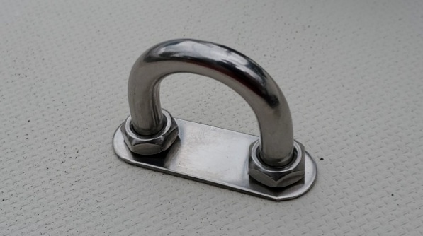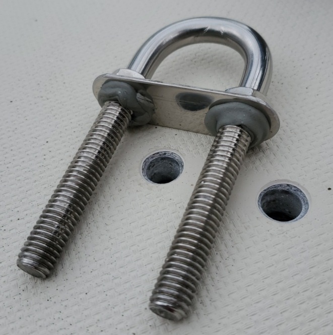 I fabricated a swivel assembly for the boom that fits in the end below deck. The unit is built around a 1" SS bolt that fastens to the gusset that was tabbed into the forepeak. |