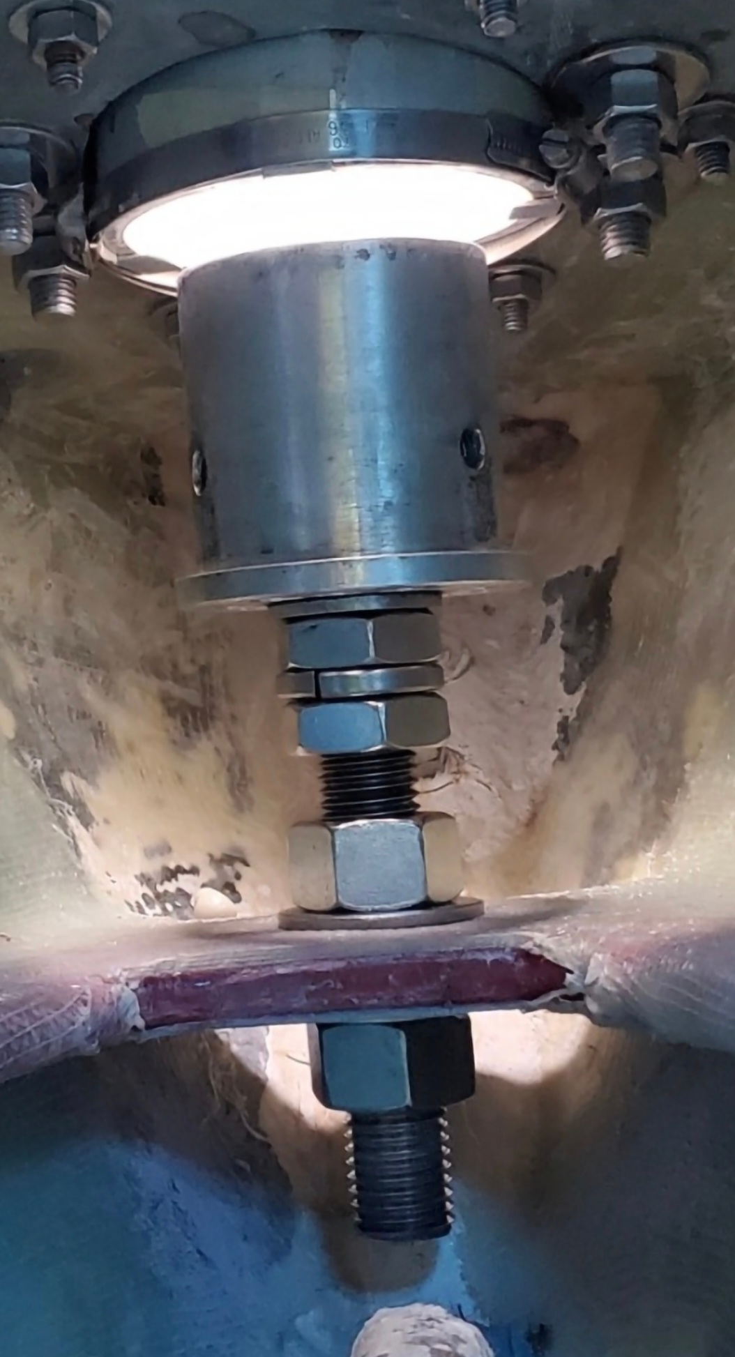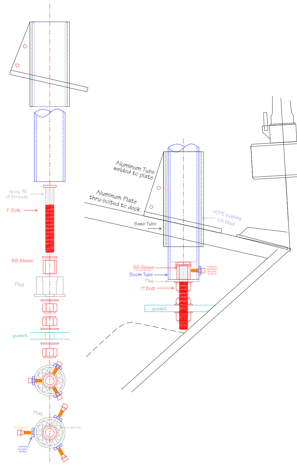 Extending the boom tube below deck made the mount stronger and reduced the bending loads on the deck. It also allows fitting a below-deck jib boom extender to hold the boom outboard. This is especially useful in light air (less than 10 kts) when gravity works against the wind holding the boom out. |