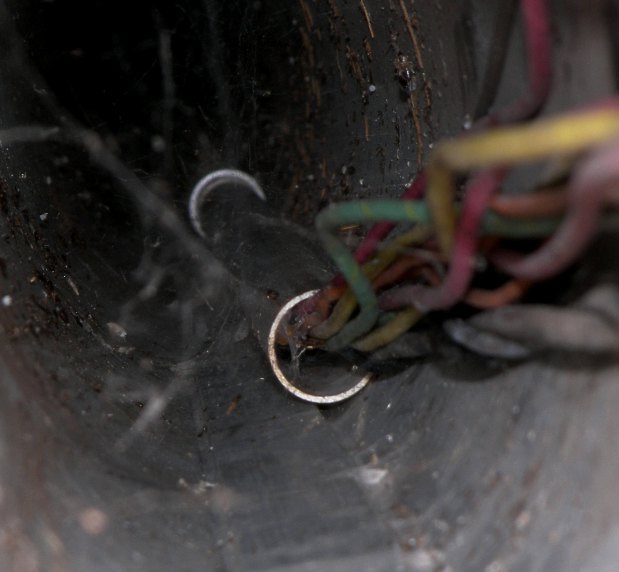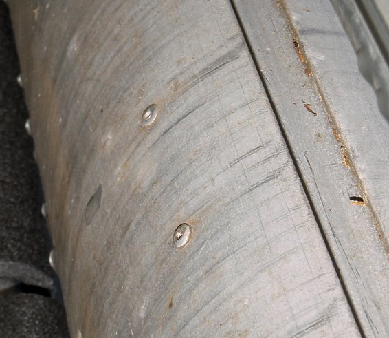 Some sources recommend drilling extra holes a couple inches away from the rivet holes so that you can take a coat hanger hook and pull the conduit against the inside of the mast for riveting. The extra hole gets filled in with a rivet. I don't like the idea of all those extra holes doing nothing and all those rivets sticking into the mast where halyards are running. I came up with another method. It worked for me you may have different luck. I drilled pairs of inline holes every 2 feet. With the mast rotated so the conduit location was at the bottom, and with the assembled conduit in place, I placed a large screw driver through the big hole for the shroud tangs to hold the conduit firmly against the inside of the mast. Then I drilled holes through the top pair of holes that were already in the mast (1" apart) and through the conduit. I took a short length of coat hanger (about 1.5" long) and bent the top 1/8" over 90 degrees and clamped he other end in my vise grips. This still fit through the holes and into the conduit. I could then hook the conduit and pull it tight against the inside of the mast. With the conduit tight I put a rivet in the first hole. With the first rivet holding the conduit down I put the second in. I needed the screw driver at the top because there was nothing to hold the conduit down. For the next pair there was no convenient hole but with the first rivet pair a couple feet away the conduit was snug enough to cut a hole in the first of the 2nd hole pair with a good sharp bit. With that hole drilled in the conduit I put in my hook, hold the conduit in place, and drill the other hole for that pair. The rivet goes in that hole then the hook comes out and a rivet goes in the other. I used rivets that were just long enough to grab the conduit with about 1/8" to spare.