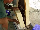 Final shaping with sandpaper on longboard, using ribs to get the final shape. Most sanding was done in the vertical plane.