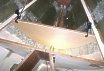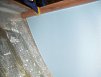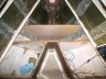 Top of the v-berth deck before cutting out. The ribs on the hull surface are the mountings for the teak ceiling strip panels. The teak strips are mounted to a 1/4" plywood pane faced with formica. |