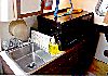 |   | This photo shows the faucet installed at the galley sink.  The lefthand knob is filtered, the right un-filtered.  The small spigot connects to a foot pump that's fed from the water tank.  This photo also shows the microwave I installed outboard of the sink.  It is fastened to the counter top. |