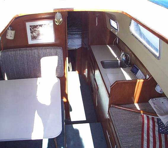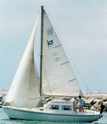 "Pearson Yacht's latest entry in the auxiliary market, the Pearson 300 features power to spare, a commodious accommodation plan, private forward cabin, large toilet room and an elevated dinette for picture window visibility. Her rig has been brought completely inboard to enable two people to handle her comfortably. The 300 is ideal for offshore cruising or for those leaving powerboating in favor of sail."
