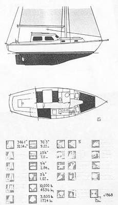 Designer Shaw Main Area 178 Hull Speed 6.48 First Yea 1969 For Tri 172 SA/D 12.1 Last Year 1970 I 31.0 D/L 348 LOA 30.3 J 11.1 BR 38% LWL 23.4 P 27.0 L/B 3.24 Beam 9.3 E 13.2 LWL /B 2.72 Disp 10,000 OR 23% Draft 3.5 CSF 1.73 Sail Area 350 MCR 30.8 Ballast 3,800 M/F 1.04Info on Design Ratios