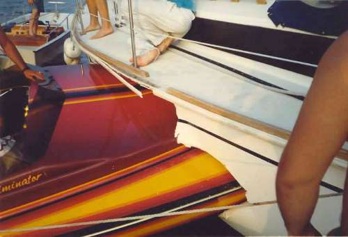 standing rigging as he went flying by airborne. No one on TP was injured,