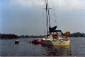 This is the view from astern. The name can be seen clearly now and compared with that in the brochure. My friend changed the home port to his address from that of Pearson (Grumman). Note that the stern ladder is deployed and underwater. Both of these boats are setting on the bottom. This accident happened on July 3, 1988, in the evening as TP was about to turn into the Islands anchorage off of the Rhode River south of Annapolis, MD.