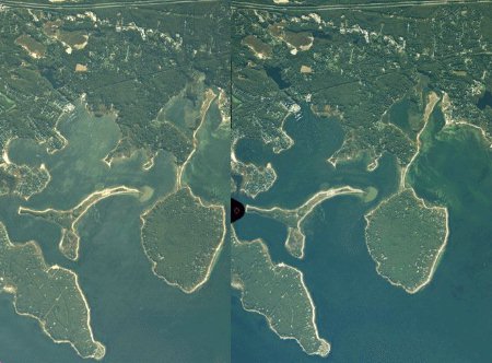 These images are from National Ocean Service coastal air photos. I got them on the NOS mapserver web site: http://mapfinder.nos.noaa.gov/ These images are stereo pairs. You can view by relaxing your eyes to combine the images. Pick a prominent feature on the image, like the right tip of the island. Take your mouse pointer and hold it over the feature on the image for your less dominant eye (that's the right eye for me) and wiggle it as you try to blend the images. This helps me a lot and with a little practice it should work for you. There is not a lot of relief in these images but what really stands out when you view in stereo is the slightly oblique angle of the photo.