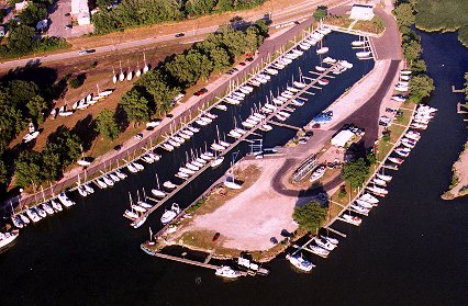 This is the Sailing Center of Grand River Marine on the Grand River in OH. This is looking south east. The Sailing Center is home to most of the boats in the Grand River Sailing Club. Our boat (Pyxis) is the last sailboat at the top on the right hand channel. It's just a bit past being even with the point of land at the far right.