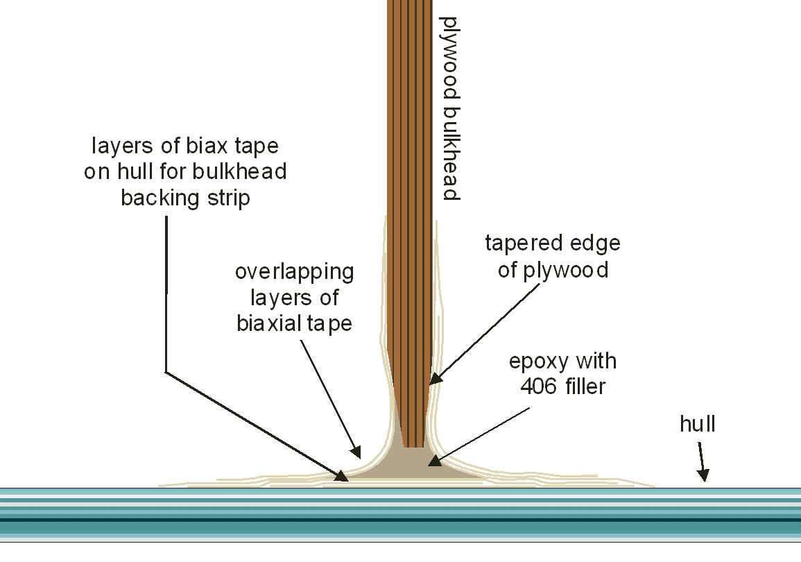 This drawing shows the method I used to tab bulkheads to the hull. I start by brushing neat epoxy (no fillers) onto hull, then several layers of biax tape to serve as a bulkhead backing strip. This is to help prevent a hard spot on the hull from the bulkhead mounting. The bulkhead is put in place and a mix of epoxy and 406 filler is filled into the gap between the bulkhead and the hull. This is shaped into a fillet to give the tabbing a gentle radius. Several layers of overlapping tabbing are applied over this. All of this is done in a continuous process so that there is primary bonding (chemical crosslinking) between epoxy layers for the entire tabbing sctructure and the fillet filling.