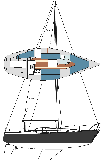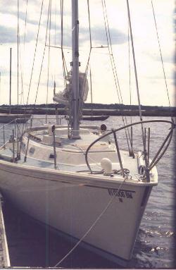 With almost six feet of draft, fairly generous beam, and a balast ratio of 44% the 10M is a stiff boat. The relatively high displacement for it's length (compared to it's contemporaries) gives momentum to punch through head seas. In puffy air, allow the boat to feather up and accelerate rather than heel. The boat is well mannered in steep chop, forgiving, and predictable on any point of sail. One successful 10M racer says It may well be worth taking a spinnaker pole penalty (girth of spinnaker and LP of genoas larger). 10M PHRF ratings range from 141 to 156. The 10M tracks well and is easy to control in steep following seas. I have seen the boat running in 5-8 foot steep chop on L. Erie with 18-25 knots of wind (main & genoa). The helmsman had never sailed the boat before that day and had never driven a boat with a wheel. There was a bit of over-steering but he was able to maintain good control in these challenging conditions.