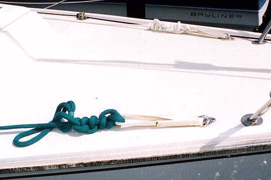 I made up endless strops from some heavy webbing. This is 9,000 lb test webbing. I took a 6 foot piece and sewed it into a loop. I passed this through the padeye and then had two loops to tie the spring lines to to better spread the load. I use a knot called an anchor hitch to secure the spring lines to the strops. This seemed like a very secure set-up and it came through Isabel without a problem.