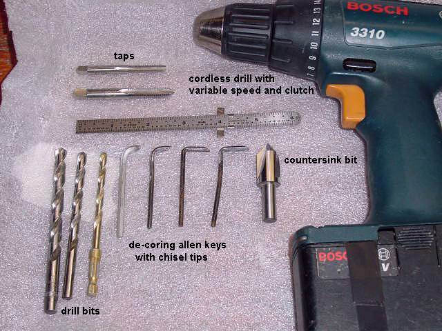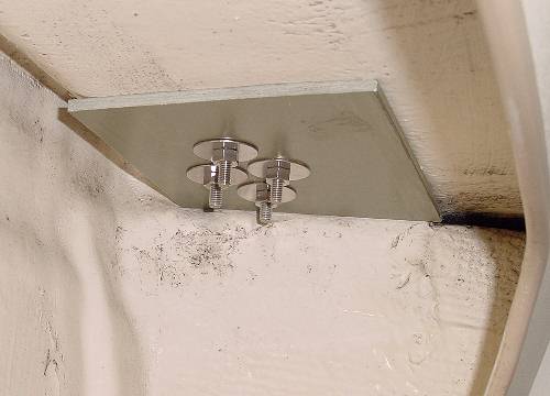 I started by drilling 1/2" holes through the outer skin and through the balsa but not through the inner skin. I did put a small hole all the way through just to be sure I was in the right place. I removed the balsa core for about a 1" radius around each hole. I have a series of three 1/8" Allen wrenches that I have cut to increasing lengths with a chisel shaped end. I chuck these in my cordless drill and use it to chew out the balsa. I start with the small one (about 1/4" long) and work up to the longest (about 3/4"). I suck the balsa chips out with a vacuum. Then I filled the holes with West epoxy with a silica filler (406) to thicken it and add some strength. Once that set I drilled 7/32 holes for the mounting screws. I tapped threads in these holes for the 5/16-18 fasteners. The threads are to provide a better seal more than for strength. I made backing plates of 1/4" thick fiberglass and put large fender washers under the heavy nuts.