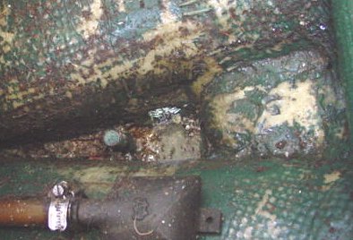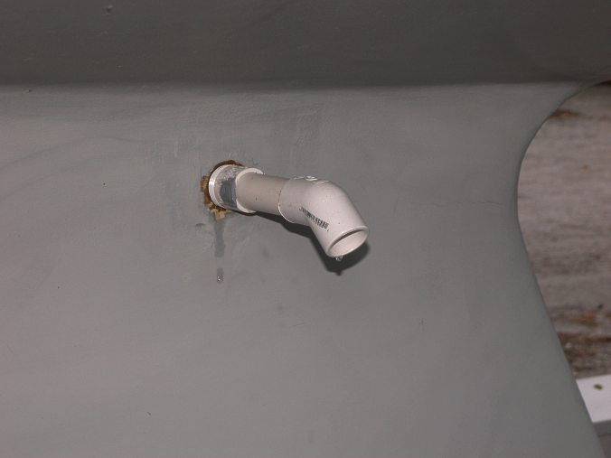 Drain Pipe Installed(click to enlarge)I put this length of PVC pipe in to hkeep the drain water from running down the side of the keel and accumulate on the cradle frame. |