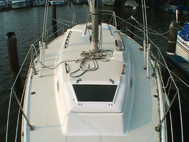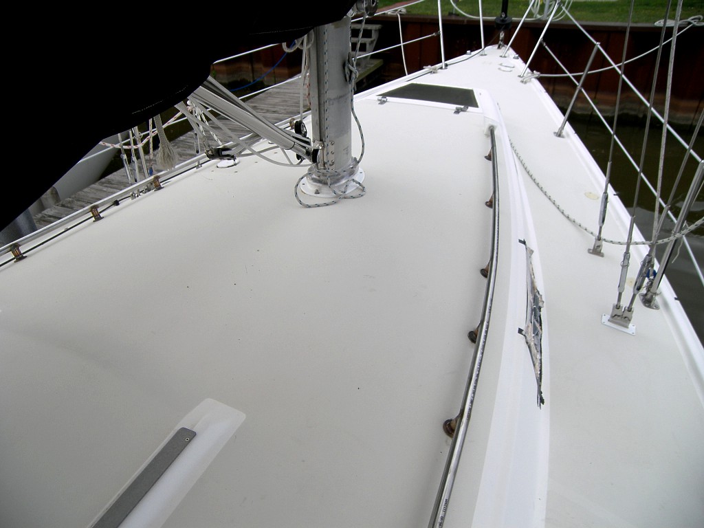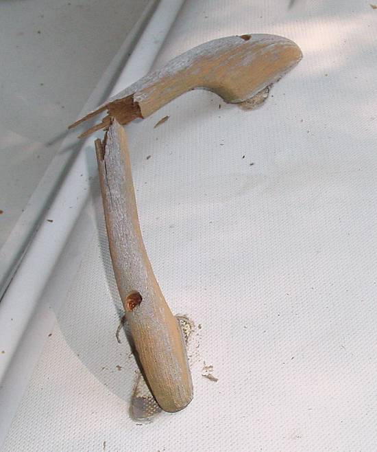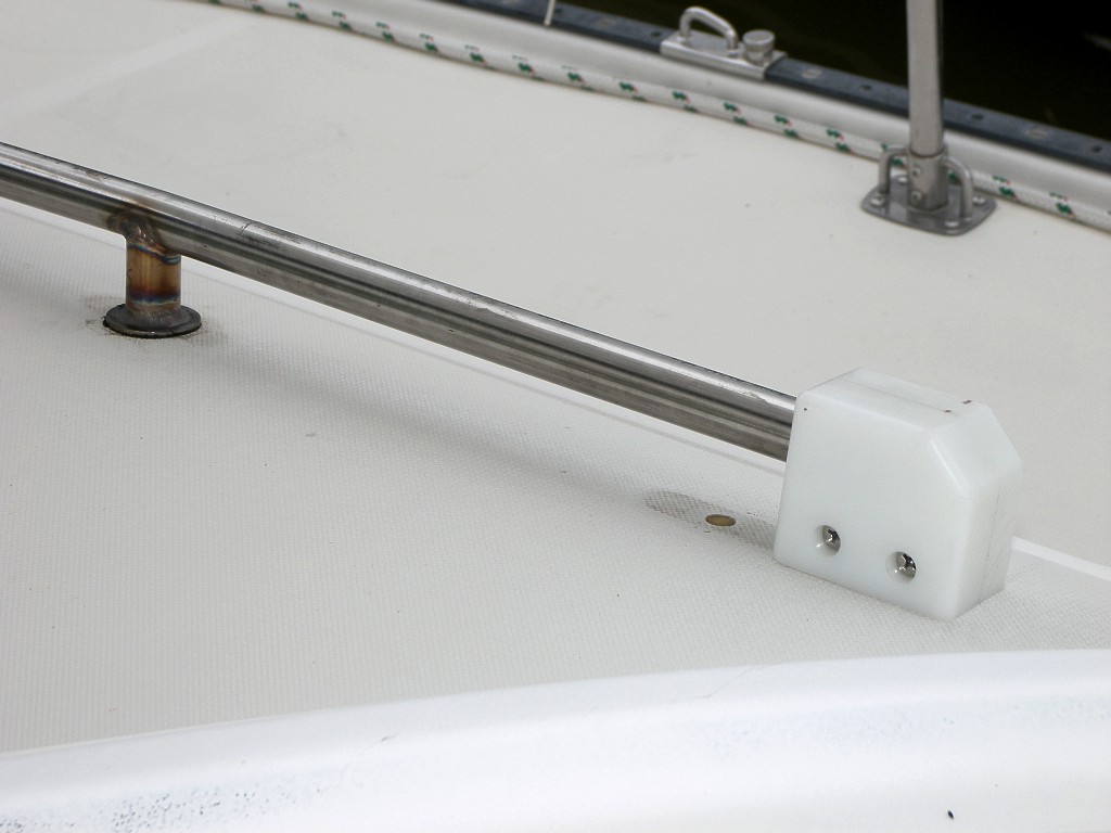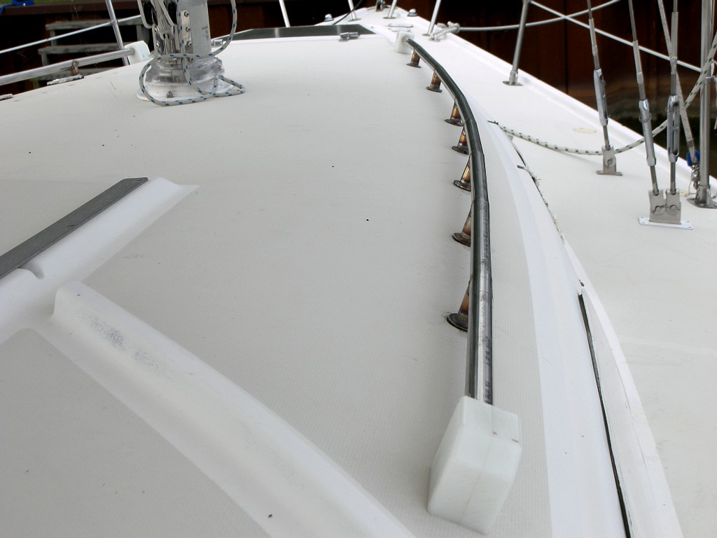 The OEM teak handrails were in weak shape after years of sanding and refinishing. This forward rail snapped in half with one swift kick.