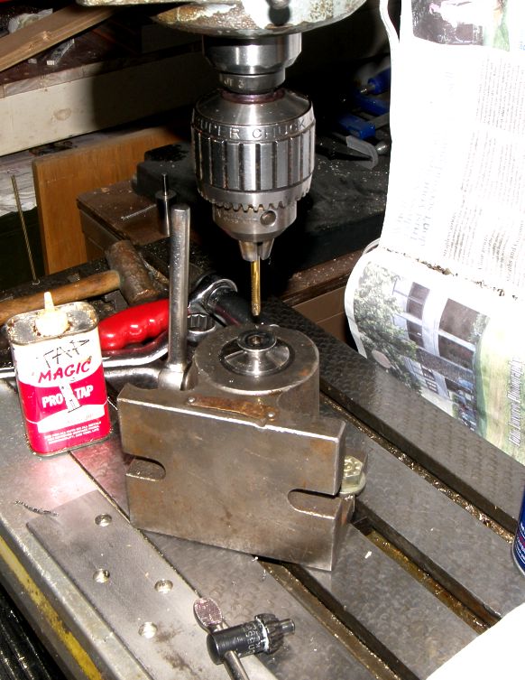 This is the setup I used on the milling machine to make the threaded holes in the screws. The screw is held in place in a 1/2" collet. The threading was done by hand in the mill. The holes are threaded for a 10-32 screw.