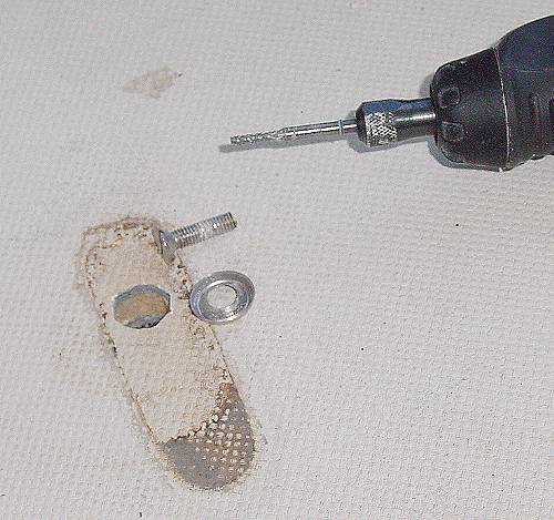 The forward handrail screw was above the headliner. I had to make a large hole to extract it from above. I used my Dremel with a carbide spiral bit. This is a very aggressive tool for cutting fiberglass but it can be hard to control.
