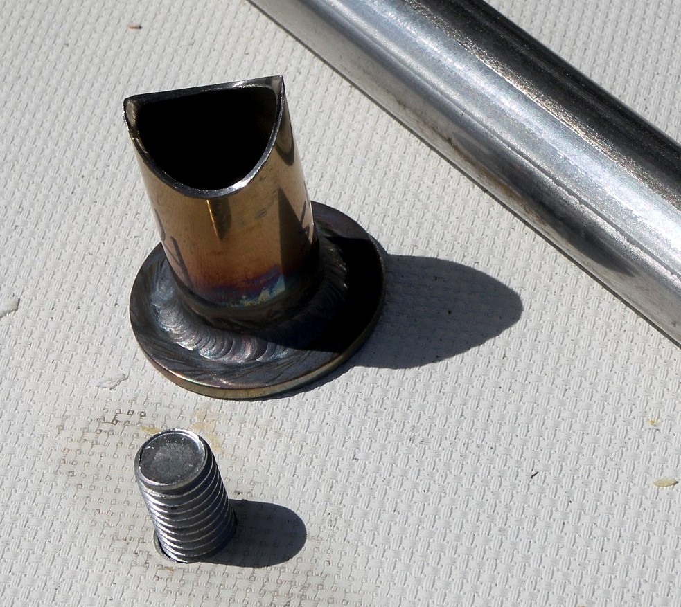 Here is a finished saddle ready to be threaded onto the 1/2 screw coming up through the deck. These were all mounted in place on the cabin top and the rails were fitted to them to get proper placement of the mounts.