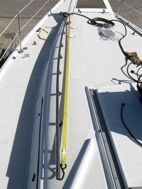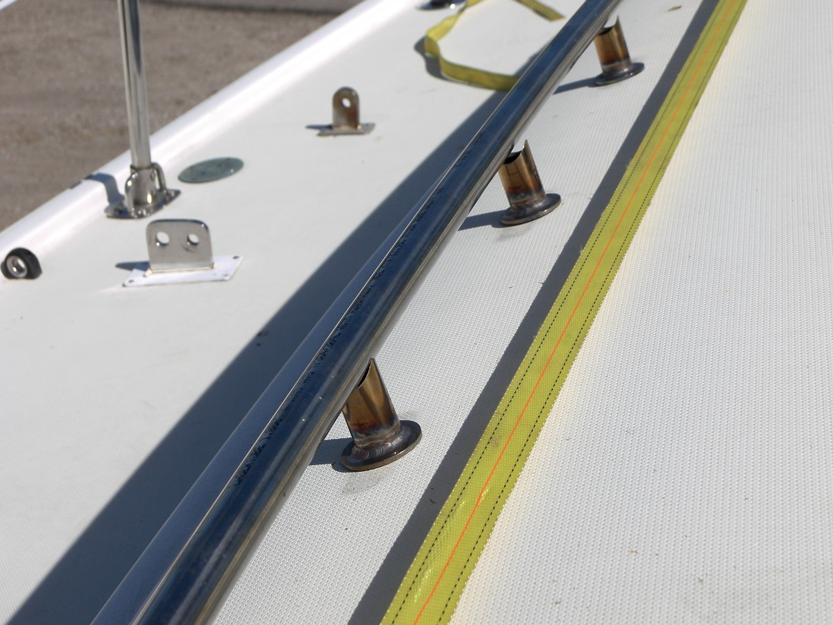 Once the saddles were in place and aligned the rails were set in place. A standard ratchet strap was used to pre-bend the rails to get the proper curve. I used .049 SS tubing for the rails. I had planned to use the thicker 065 like I used on the saddles. Once mounted the 049 tubing seems more than strong enough. I got this tubing locally for about half the price of the tubing they sell at West Marine. But the West tubing comes fully polished and that might have been worth the added expense ($70) depending on how much work it takes to polish these. Mail ordering the tubing is another option but 10' lengths are a lot more to ship.