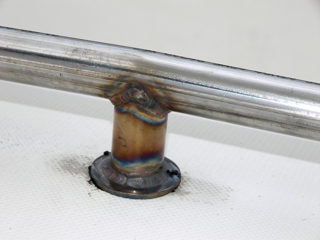 Here is the finished weld on a saddle. The welding process causes some distortion in the SS tubing. That makes it kink a bit over the saddles and made it necessary to adjust some of the mounting holes a bit. The mounts are sealed with butyl tape.