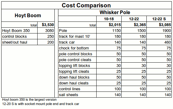 So the basic comparison that includes all the component costs is about $3,500 for the Hoyt Boom, and $2,000 to $3,000 for a Forespar line control mast mounted pole depending on options. Installation would probably cost a bit more for the Hoyt boom becasue of the under-deck backing plate needed. Or you could just have the pole for about $1,200 but you still need a way to stow it, and some control lines so maybe $1,400 that way?