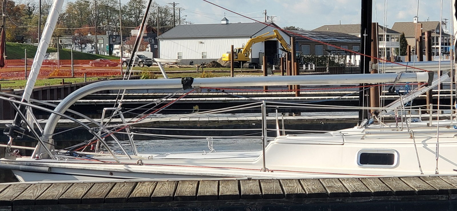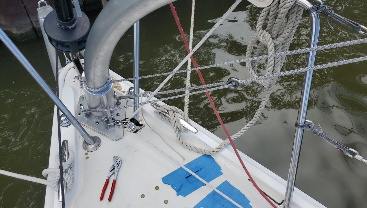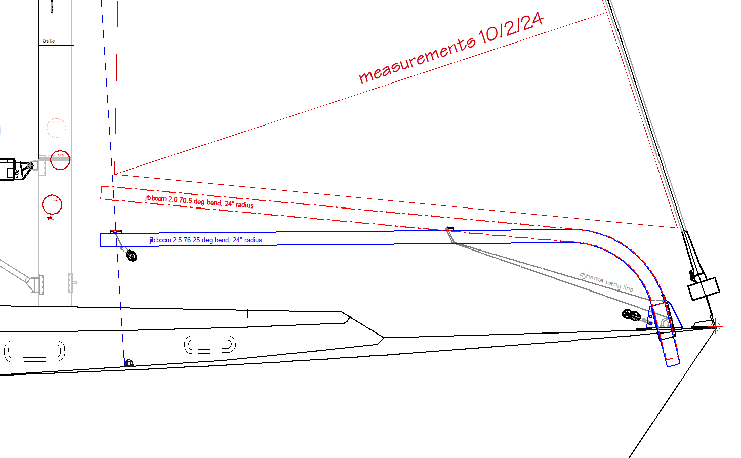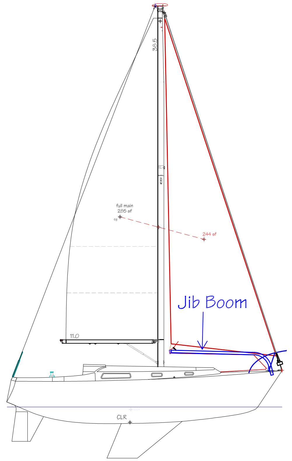 Results have been very good with some bumps along the way that I will detail below. The new boom is a bit heavier than the Forespar unit (maybe 65 lbs vs 40lbs ??) but the geometry is much better and performance is improved. I no longer loose luff tension as I ease the boom and I can now wing out the boom in any wind strength without Mr Gravity interfering with my plans by making the boom fall back to centerline. I do give up some upwind performance in light air to the #1 genoa but not as much as you might expect. With jib boom #1 the performance crossover point from genoa to jib was at about 14 kts TWS. Now it's more like 8? Also thanks to a new jib better optimized to fit the boom. |