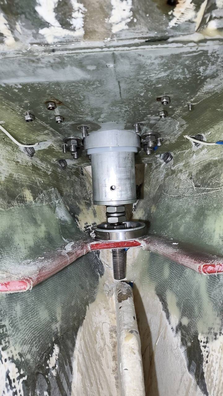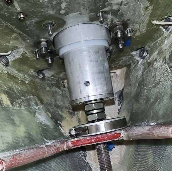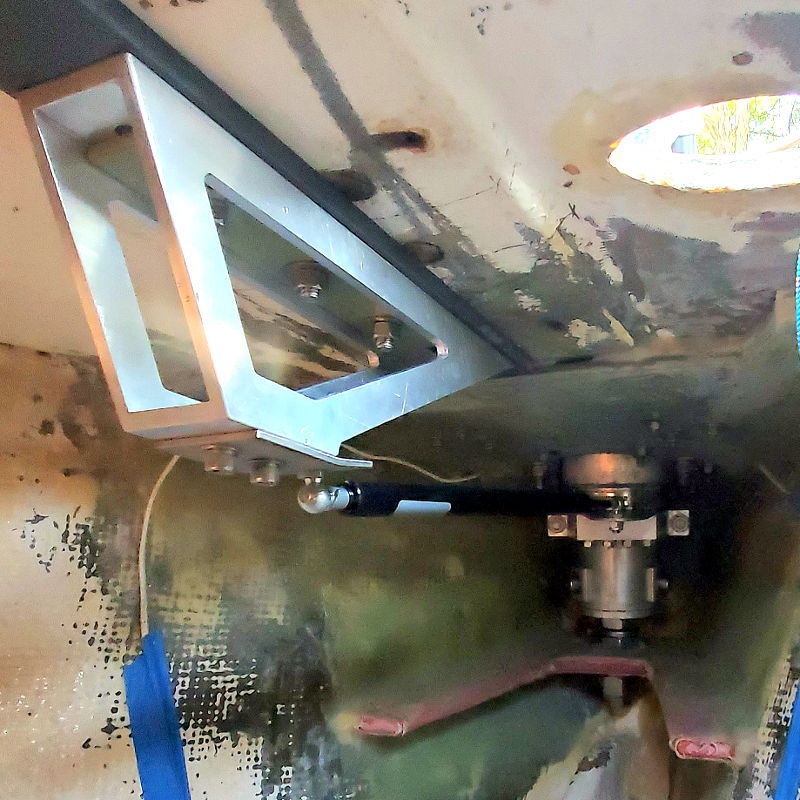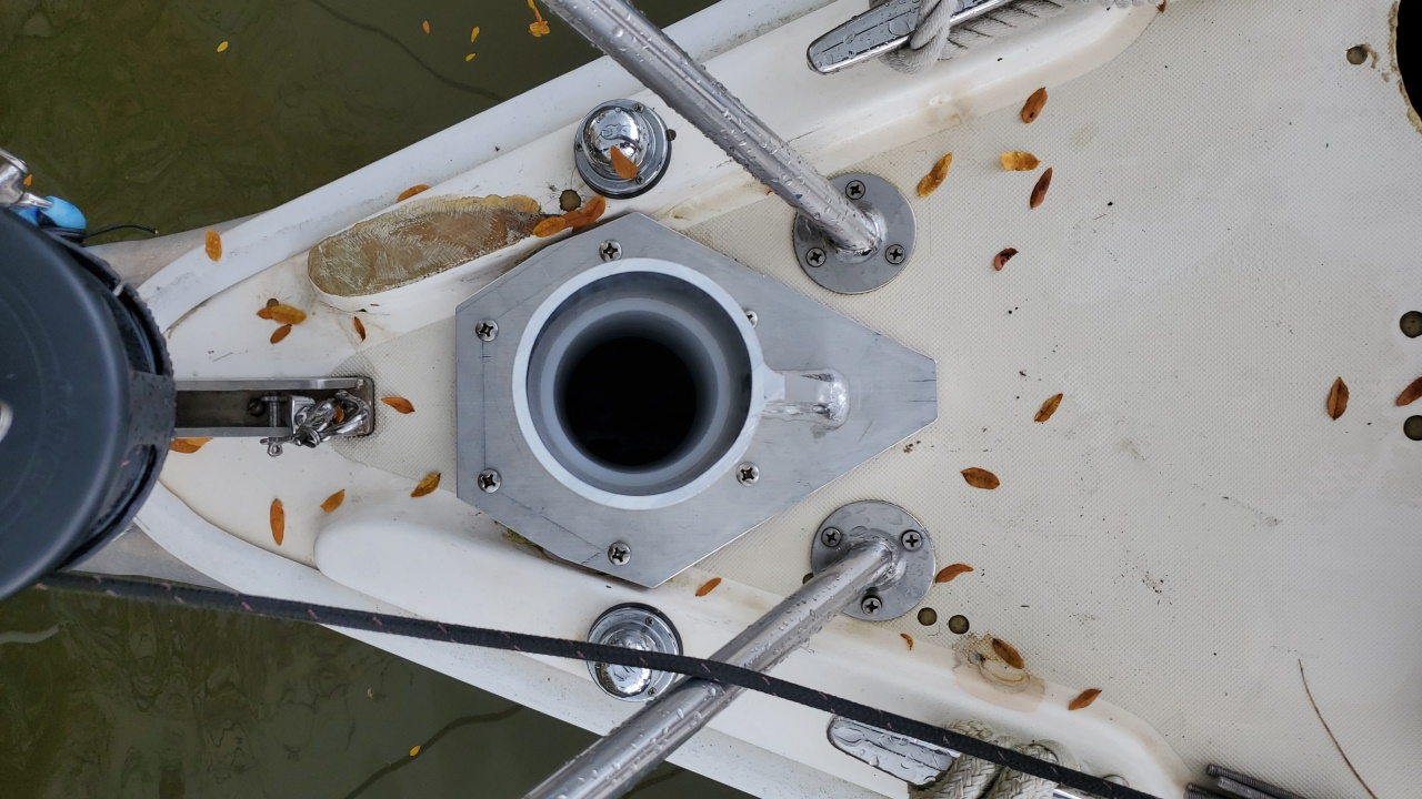 Extending the boom tube below deck made the mount stronger and reduced the bending loads on the deck. It also allows fitting a below-deck jib boom extender to hold the boom outboard. This is especially useful in light air (less than 10 kts) when gravity works against the wind holding the boom out. |