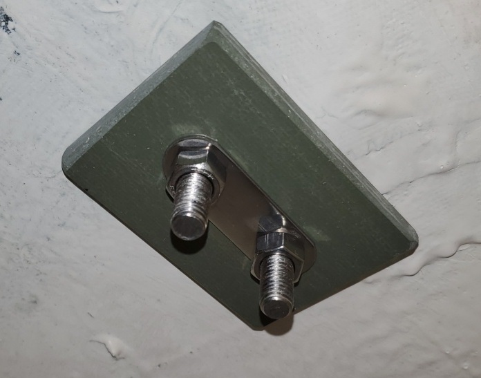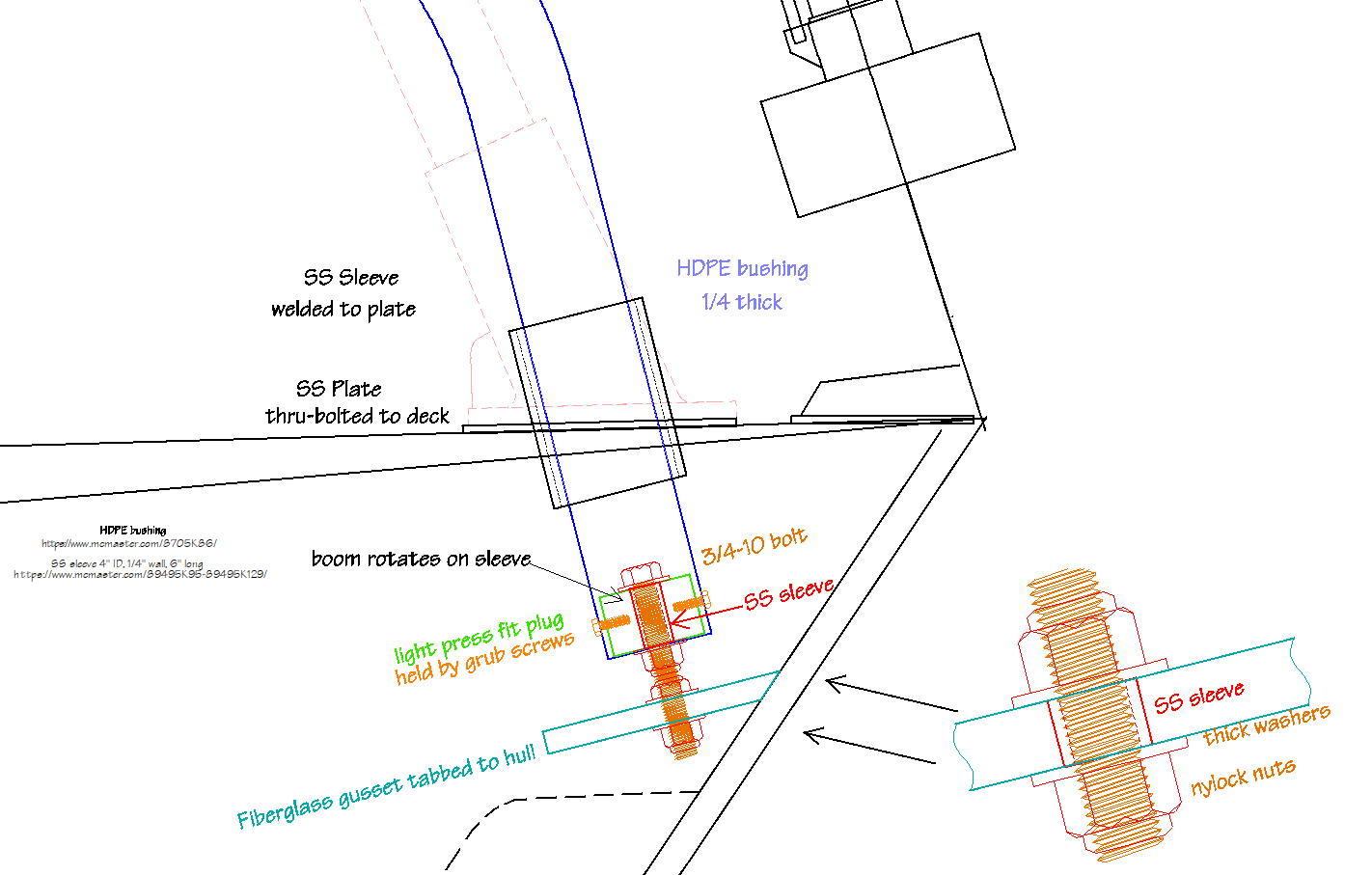 I fabricated a swivel assembly for the boom that fits in the end below deck. The unit is built around a 1" SS bolt that fastens to the gusset that was tabbed into the forepeak. |