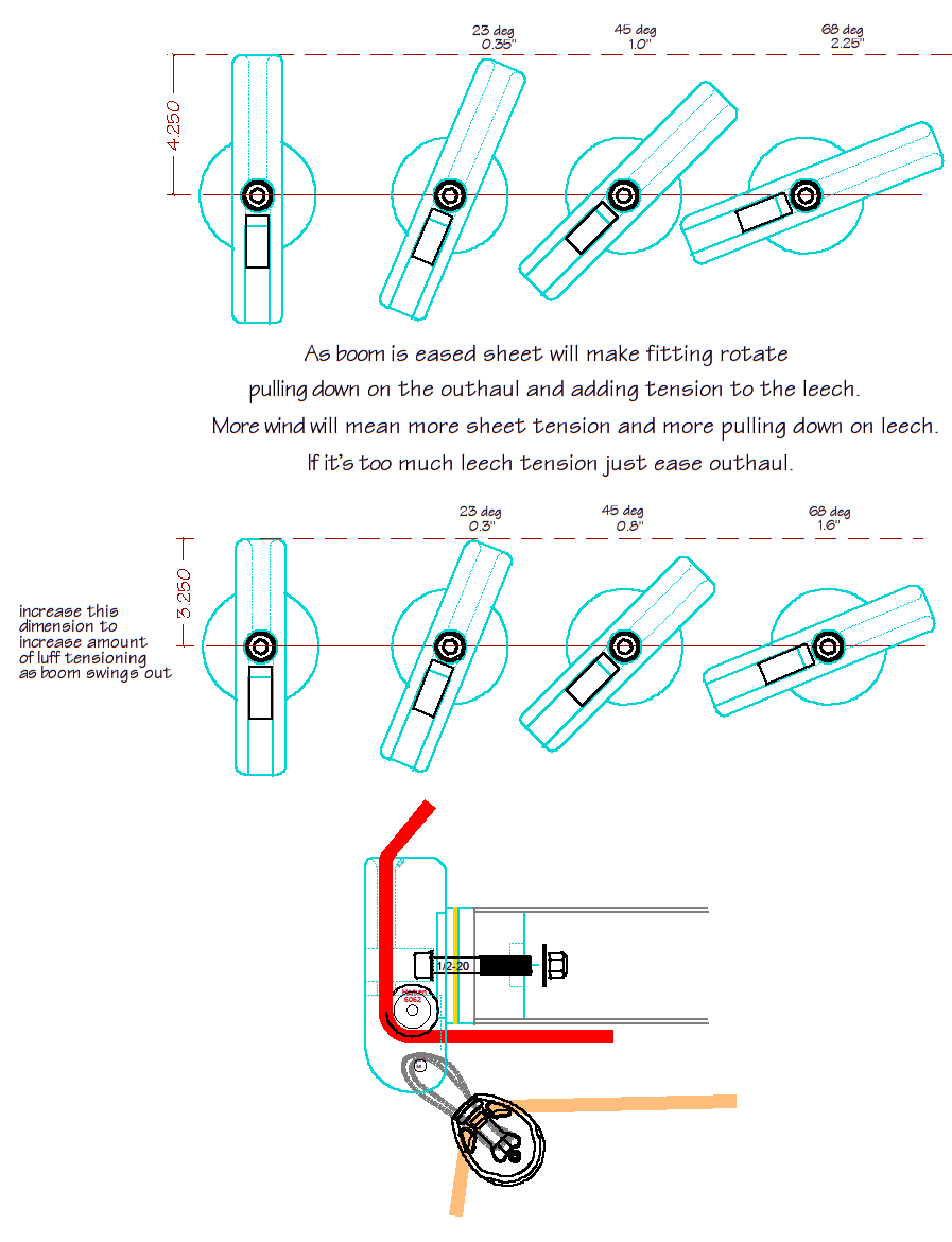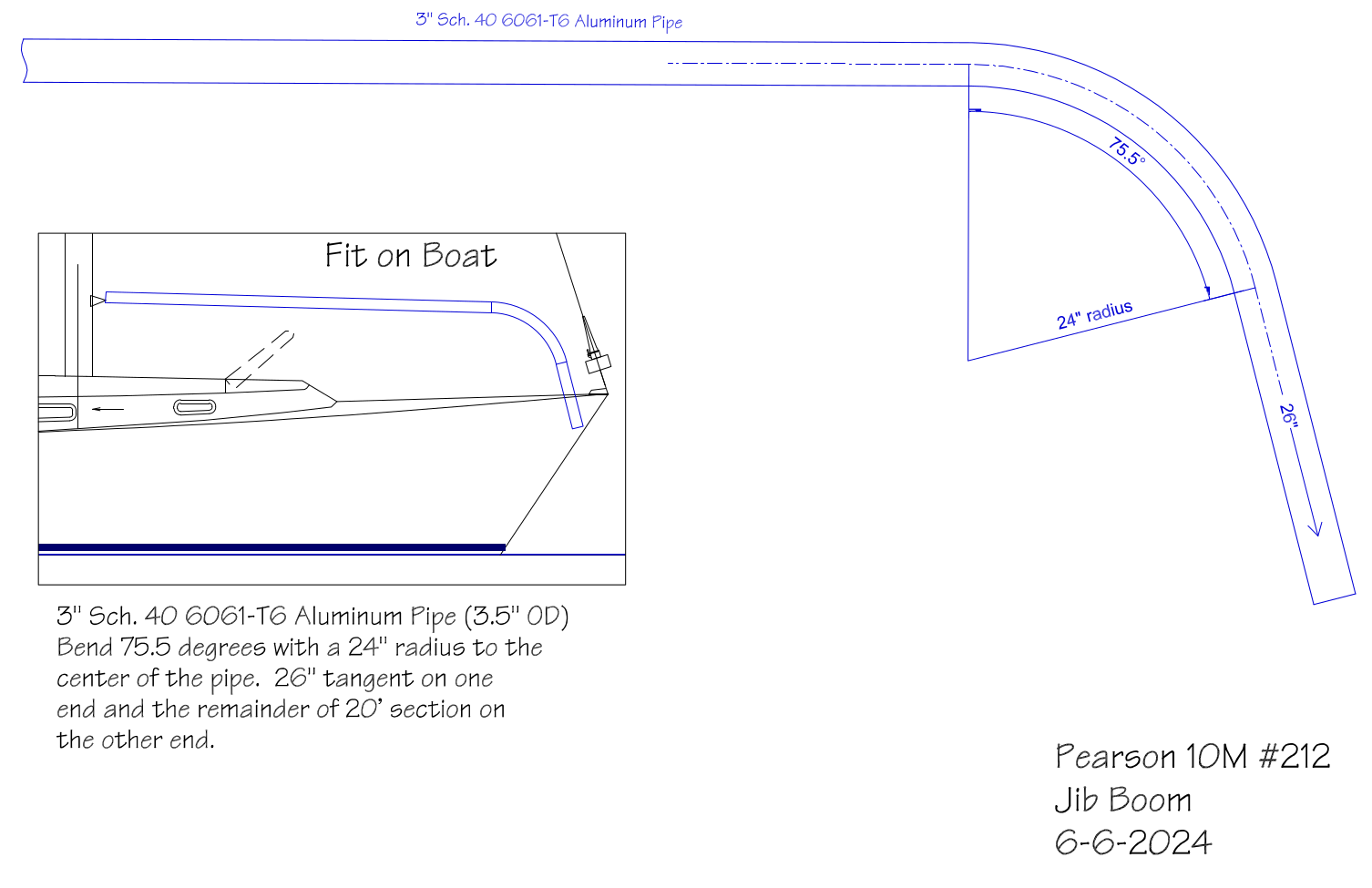 The geometry of the Forespar Hoyt jib boom was not a perfect match on my 10M. It gave some significant and proven advantage in use but pivot angle of the boom meant that in use it was giving up luff tension as the boom was eased. I fabricated a new boom to correct this and to add some additional features to enhance performance.