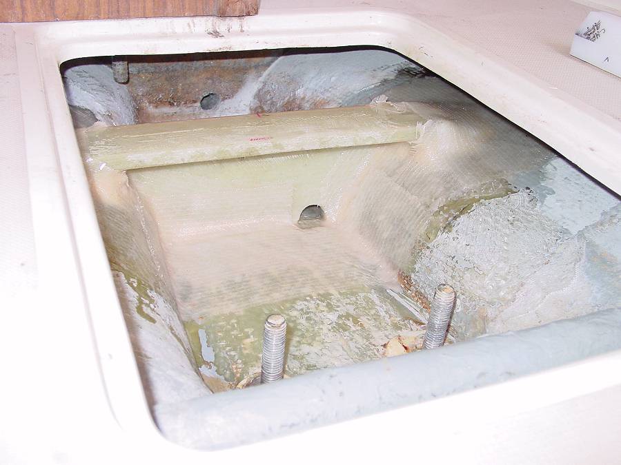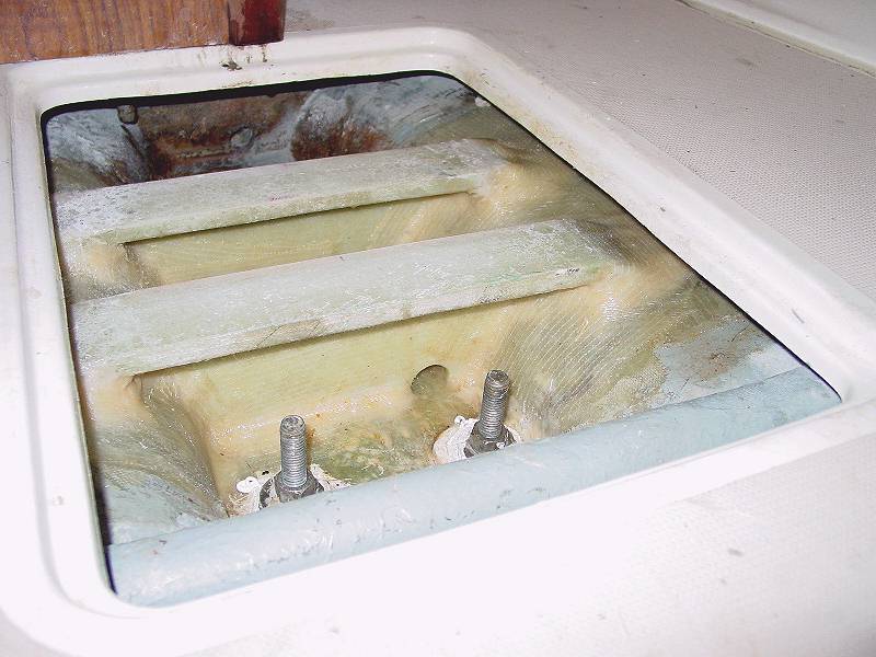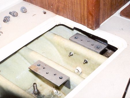 The owner of Jade (#187) also owns Hornpipe (#38) and has refined the process of that used in #212 to reduce labor time and costs with little or no loss of functionality. Fiberglass floors are fabricated off the boat. The floors are an inverted L-shape (with flange at the top as in the J/35) eliminating the stainless steel angle brackets used in #212. The fiberglass mast step plate bolts directly to the flange. The floors are tabbed into the bilge with biaxial tape and biax/mat in the same manner as in #212.