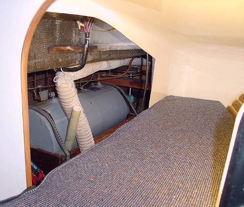 Access to the engine and the gear just aft of the engine is not very good on the 10M. The quarter berth takes up a lot of space in the port cockpit locker that might otherwise allow good access to the port side of the engine. I cut a large access panel out of the inboard side of the quarter berth. The opening is about 30 inches long and I can lie on the quarter berth and easily reach the engine and the steering gear at the pedestal base. I now call the quarter berth the Jeffries Tube.
