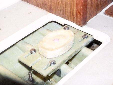 The top plate is attached with four 1/2" bolts that thread into the angle brackets. These fasten the plate down and act as alignment pins for the top plate to slide on. The plug for the mast to sit over is fastened from the bottom with four 5/16 countersunk bolts. This photo shows the mast step plate in it's aft position.