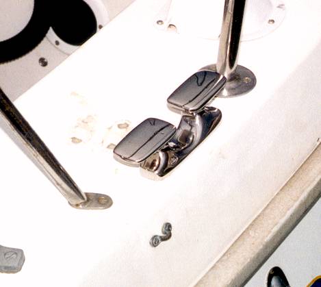 I removed the somewhat undersized stern cleats and replaced them with these Cleat/Chocks from New Found Metals. They mount with 3/8 studs. I made backing plates from 1/8" thick stainless steel. The holes were opened and filled with epoxy/406 filler then re-drilled for the studs. I sealed the mountings with Boat Life Sealer Caulk.