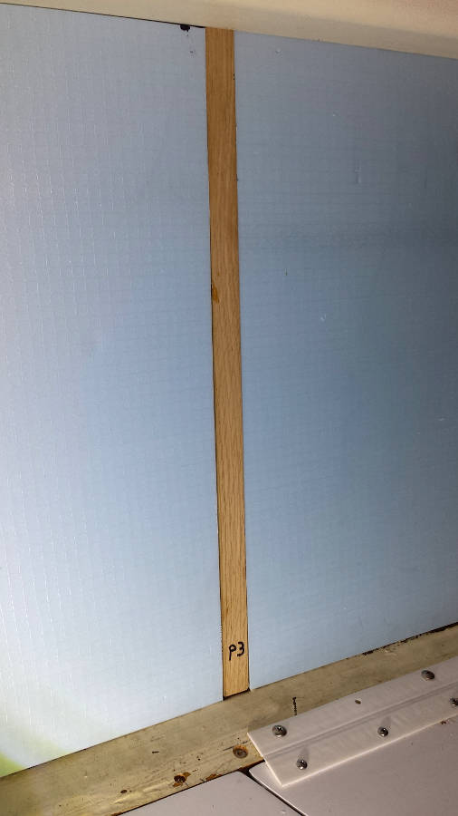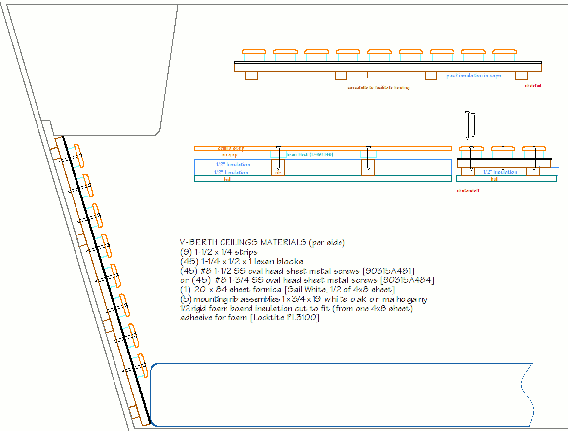 Over all this goes a layer of white formica. Then the ceiling strips go on and are screwed to the oak ribs with 1/2" standoffs so that air can circulate behind the strips and maybe for some back-lighting.