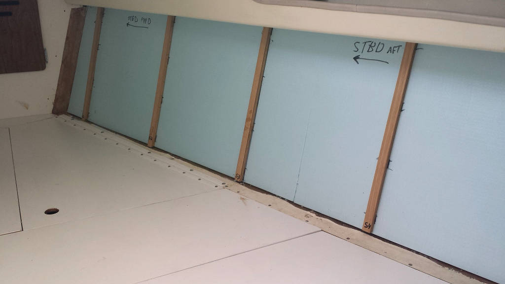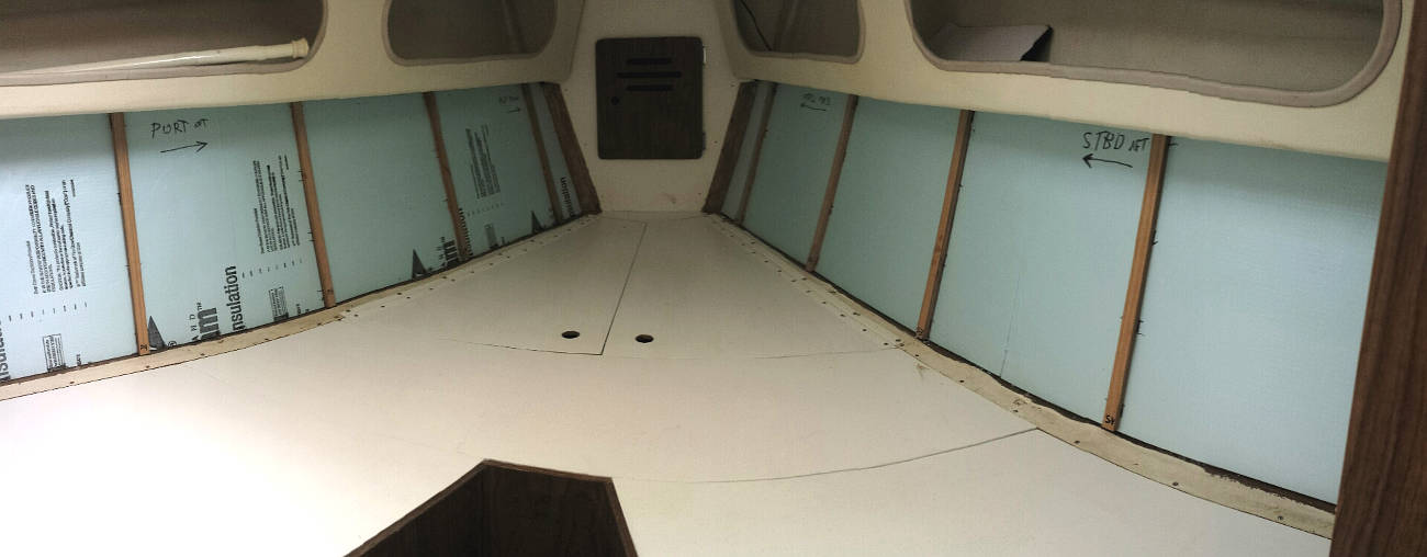Fist I removed the original plywood with teak strips and peeled the hat ribs from the hull (very easy). Then I cut and fit a 1/2" layer of foam insulation board. I did this in two pieces because I couldn't maneuver a single piece into place because of the geometry. I made some new ribs from 1/2" thick white oak and added small square pieces of white oak onto the ribs. I cut small square holes in the foam board that these squares on the ribs fit into.