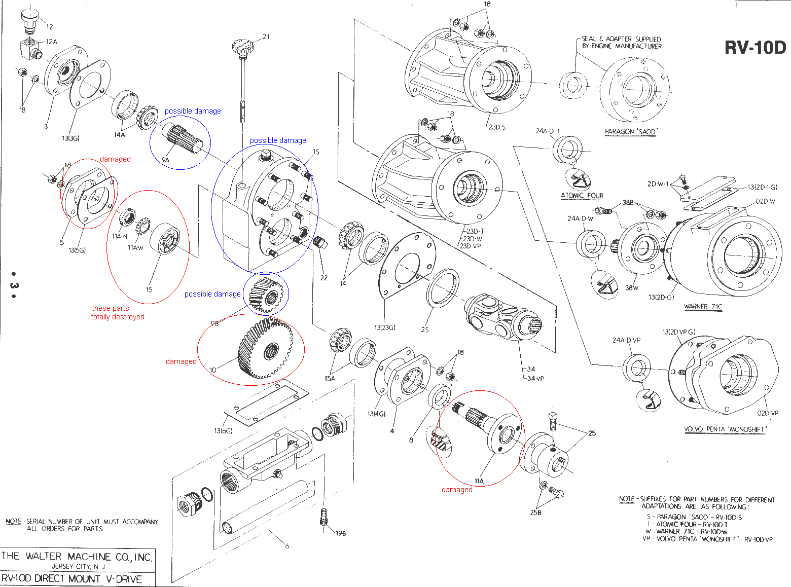 In the fall of 2002 my Walter RV10D V-drive developed a problem. One of the bearings disintegrated spreading ground metal throughout the unit - that's bad. My best theory on the cause of the damage is that a yard mechanic decided the way to remove the propeller (that the PO had changed shortly before I bought the boat) was with a hammer. Prop pullers exist for a reason. The pounding damaged the bearing but it didn't show up as a real problem until I had run the unit for 50 or 60 hours. Or maybe the bearing just broke. But if had lasted 23 years before that and the PO was diligent about general maintenance like oil changes from what I can see.