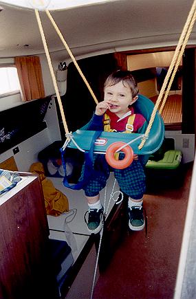 New Crew!In May 1999 we added a new crew member. Alex was born on May 12. His first visit to the boat was at about 3 weeks (we just sat at the dock). His first ride was at 5 weeks and his first ride with real wind and waves was at about 7 weeks. He seemed to like all this but at that age we really only know what he doesn't like. I have spent a lot of time considering ways to keep Alex safe and comfortable onboard. On this page I will describe what I have done to prepare Pyxis for the new crew member. |