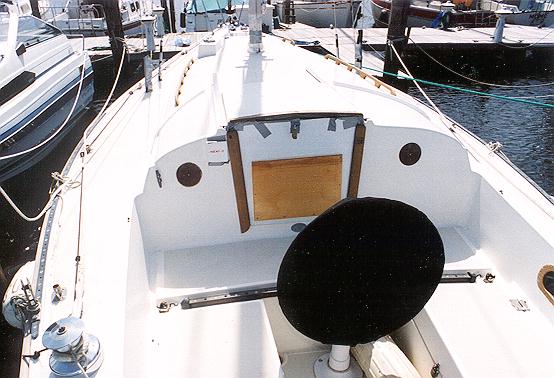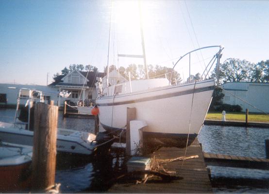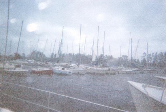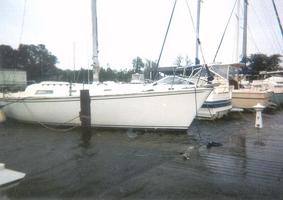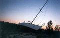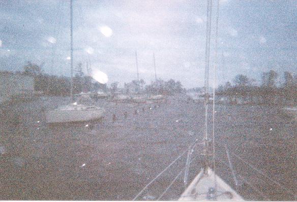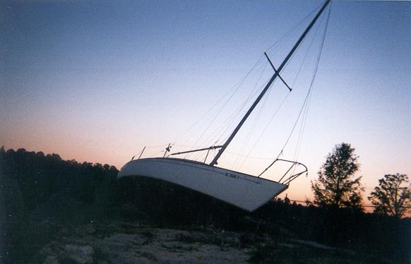 | Some boats weren't secured so well. This Catalina 25 came loose and was blown across the parking lot near high water. Photo by Alex Pfeiffer - 4yrs old. |