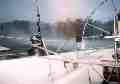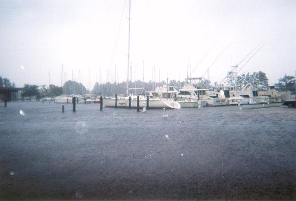 | Rising water at about 11AM. Water is about 2-1/2 feet above normal. The finger dock is awash. Lines look good. |