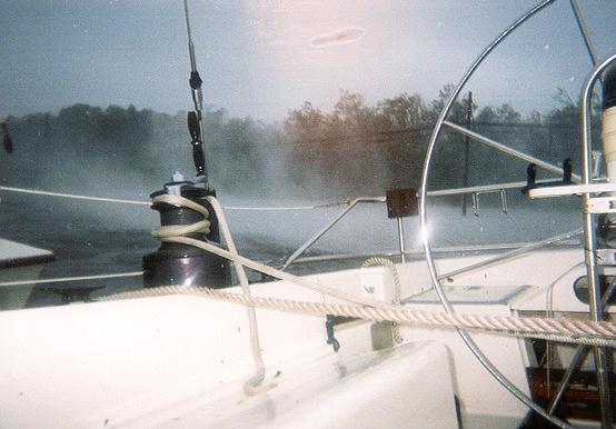 | From the cockpit of Windy at about storm peak around 5PM. Water is well over the parking lot and the road beyond. |
