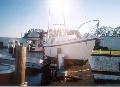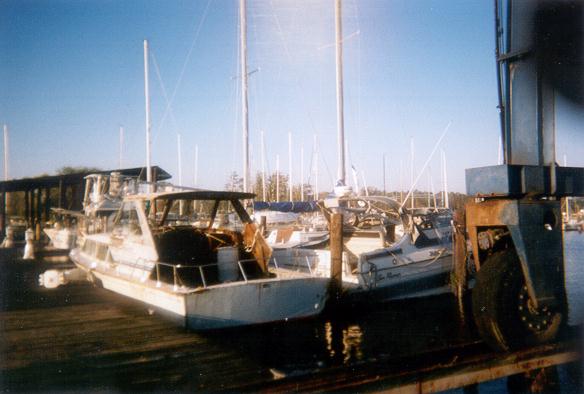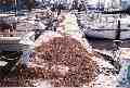 | This power boat was on stands 300 feet from the water. It floated off and ended up in the water sideways in the pilings. A crane will be needed to get it our. Or maybe a chainsaw? |