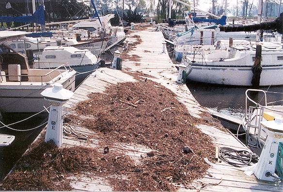 | The dock looks more like a fun house walk the day after the storm. All that brown stuff is pine needles. In Winston-Salem people pay good money to have pine needles dumped on their yards. |