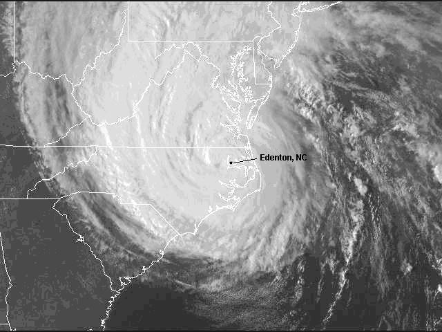 | NOAA Satelite image if Isabel at about 5PM. This is about the time of closest passage of the eye to Edenton. The center of the eye is about 40 miles WSW of Edenton. |