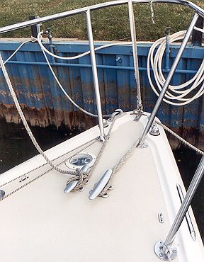 In this photo you can also see padeyes I mounted just inboard of the toerail to lead the upper lifelines to. This lets the sail go over more easially and keeps it from bagging up on the lifeline. They are placed so the lifelines reach them just as they reach the pulpit. In retrospect I should have mounted these further forward right behind the forward pulpit base and extended the lifelines with a short wire. The sail would then slip outboard nicely and there would be a much smaller gap between the pulpit and the lifeline. It's a bit of a moot point now since I tend to fly the headsails off a pennant that puts the foot up above the lifelines (and gets the sheet lead further aft for a tighter angle). But my 150 is too long in the luff for this so I may add the forward padeyes. Eitherway, sail shape is a lot better when the sail has a fair lead around or over the lifelines.
