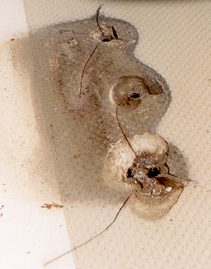 To repair the area I cut 1/2" holes in the outer skin, removed the balsa for about 1/2" around the holes and filled with West epoxy with a 404 filler. Before the epoxy set I put the hatch in place, aligned the hinges and placed 10-24 screws coated with wax and cut to length in the epoxy. I also ground out the cracks in the gel coat and filled in with epoxy. The color of the epoxy with 404 is very close to the tan non-skid on my boat. The gel coat was very thick here. The white was about 2.5mm and the tan non-skid (that's gel coat too) was another .5mm. That's pretty thick gel coat. I have heard that thick gel coat can have more tendancy to crack. After the epoxy set I backed the screws out and ground the epoxy down flush with the deck.