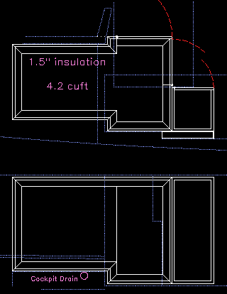 This is a concept drawing of a built in ice box that extends under the cockpit. As drawn the ice box has 4.2 cuft with 1.5 inches on foam. That's probably not enough but that's what I drew. The box could easially extend further aft to add volume. This configuration makes the step a bit higher so I added another small step. I don't know if it would be necesary or good. This would no longer be possible with this ice box. Every time I consider this or other ice box projects I make a few drawings and think about it for a while. I always seem to decide that I am better off with a big cooler slid under the cockpit. Sometimes I flip the step up out of the way and stand at the very aft end of the cabin. I can just peak over the hatch and it's easy to get at the sink. I don't think I want to give that up for this cooler.