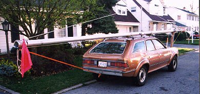 Here is the mast on the roof of my car after the trip home from the marina. I set up a line on a spreader to stabilize the mast and keep it from flexing. I also supported it with a strut on the front bumper. The set-up was very stable and I had no trouble manueuering. And no tailgaters.
