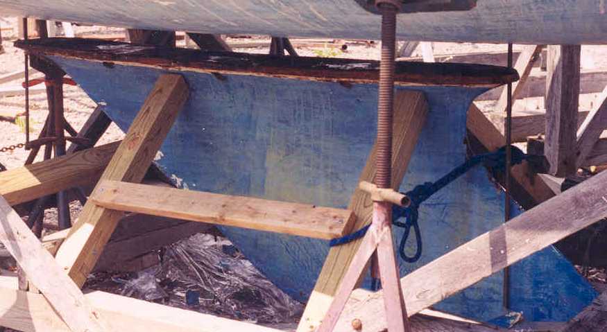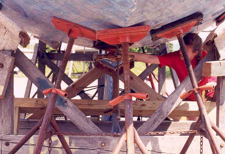 Third step - brace the keel. I built a stand of 4X4 lumber bolted right to the cradle in order to hold the keel in place. I backed this up with a jackstand at the forward end of the keel just aft of the first bolt.
